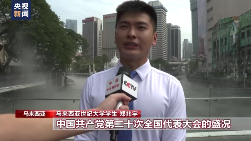 马来西亚世纪大学学生 郑兆宇:中国共产党第二十次全国代表大会的盛况极大地激励了我们海外学子。习近平总书记提出的“人类命运共同体”理念让我更加深刻地感觉到祖国作为负责任大国的胸怀与担当。